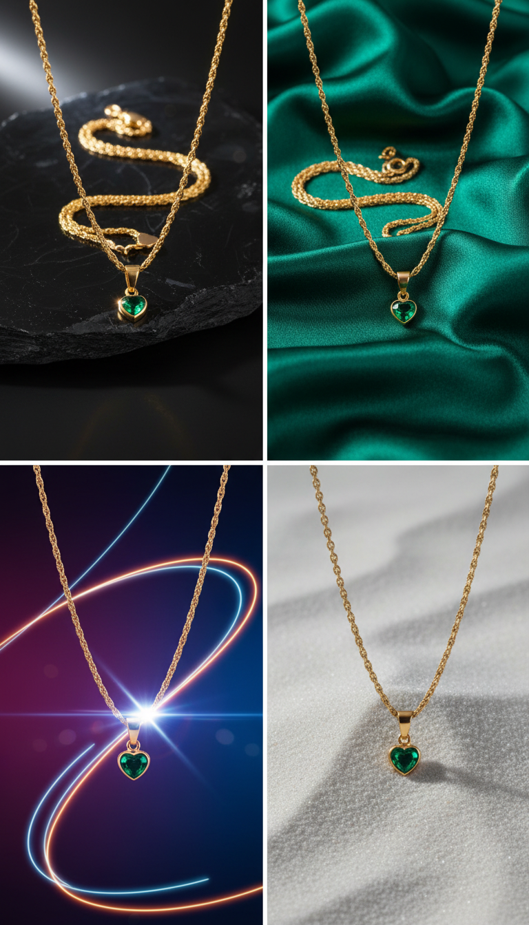 Exquisite AI-generated photography of a gold chain necklace with a small, green heart-shaped pendant, perfect for everyday elegance.