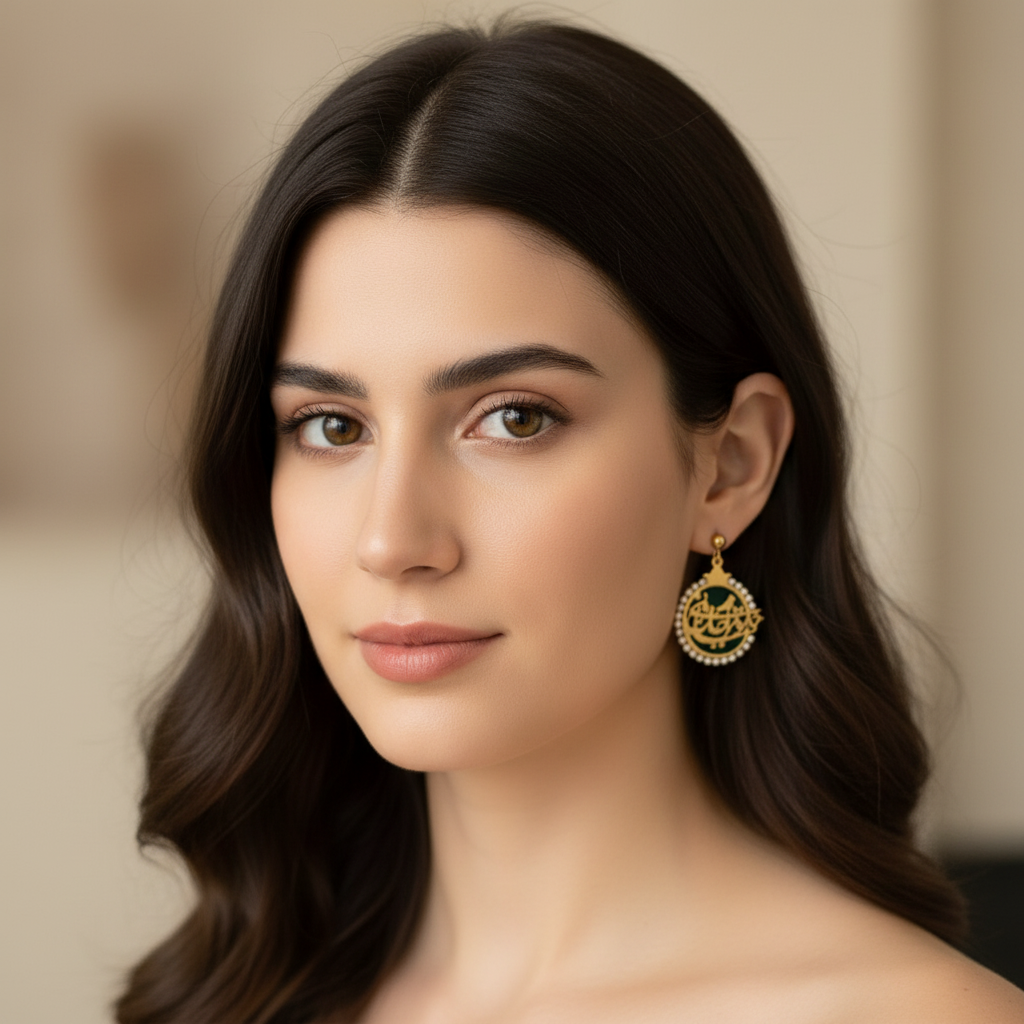 High-quality product photography of Arabic calligraphy earrings. AI-generated image perfect for jewelry stores and online advertising. Shop now!