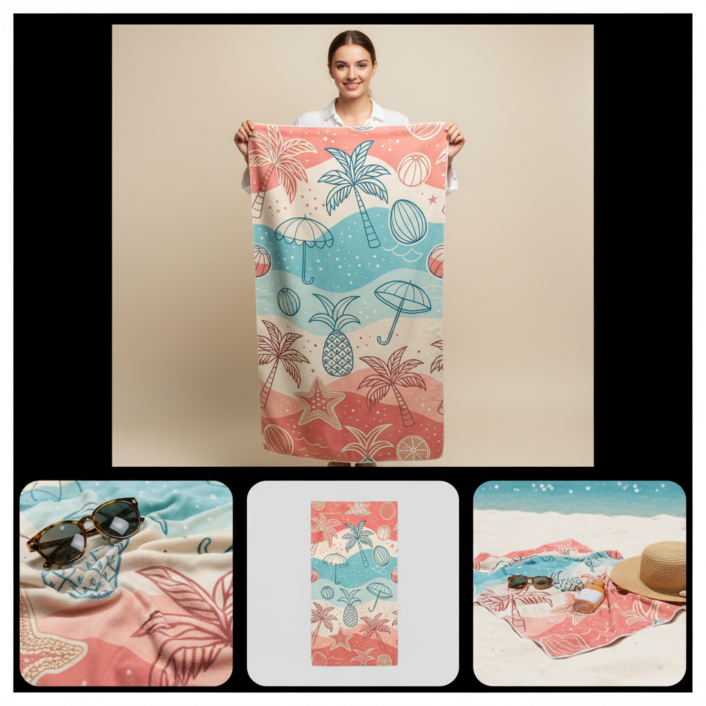 Vibrant beach towel lifestyle product photography. AI-generated image showcases summer vibes for e-commerce, marketing & more. High-quality and optimized.