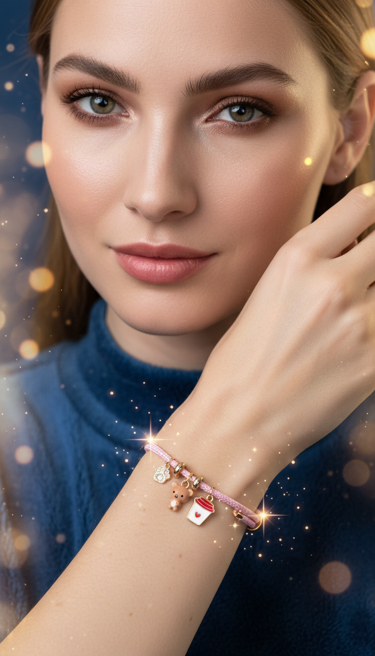 Stunning charm bracelet photography showcasing a playful and elegant design. AI-generated product photo ideal for jewelry marketing and e-commerce.
