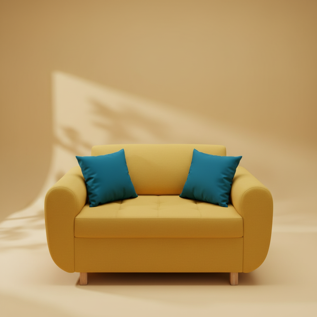 Stunning AI-generated product photography of a modern yellow sofa with blue pillows. Perfect for interior design websites and furniture marketing materials.