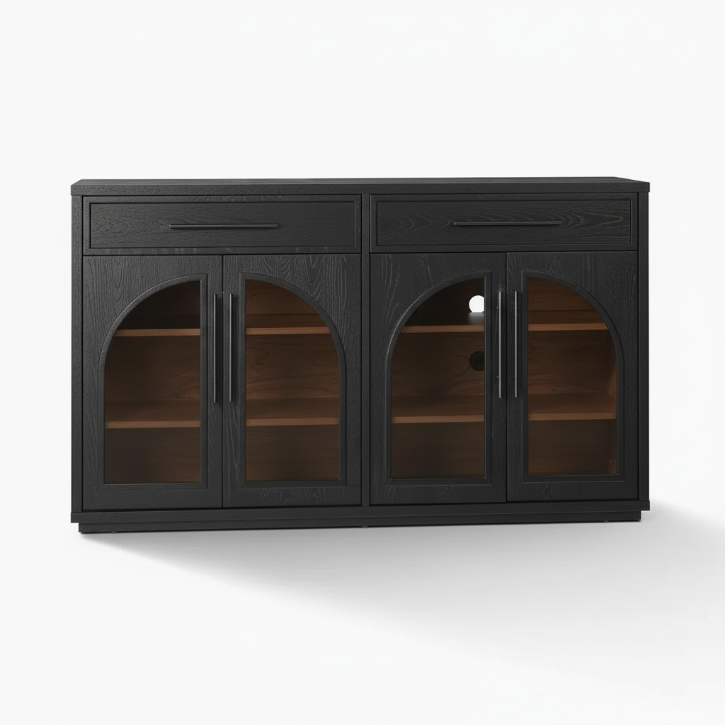 High-quality black arched media console photography. AI-generated product shot ideal for furniture catalogs, e-commerce, and interior design marketing.
