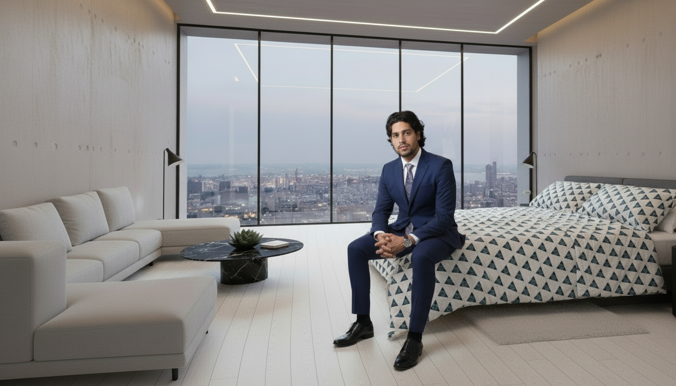 Professional architecture photography featuring a man in a suit in a stylish hotel room. AI-generated image for luxury travel marketing.