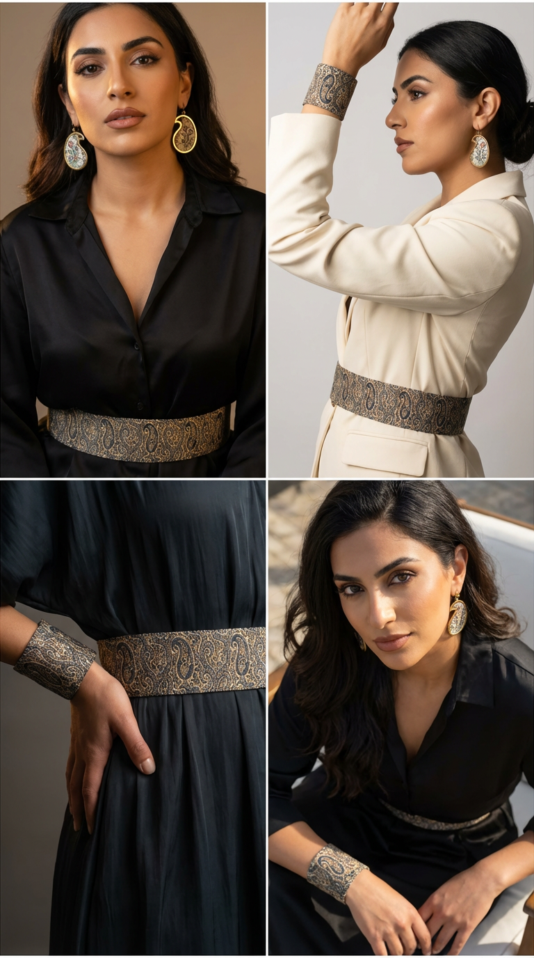 Stunning editorial photography of a paisley cuff and belt. AI-generated fashion images perfect for branding and e-commerce marketing.