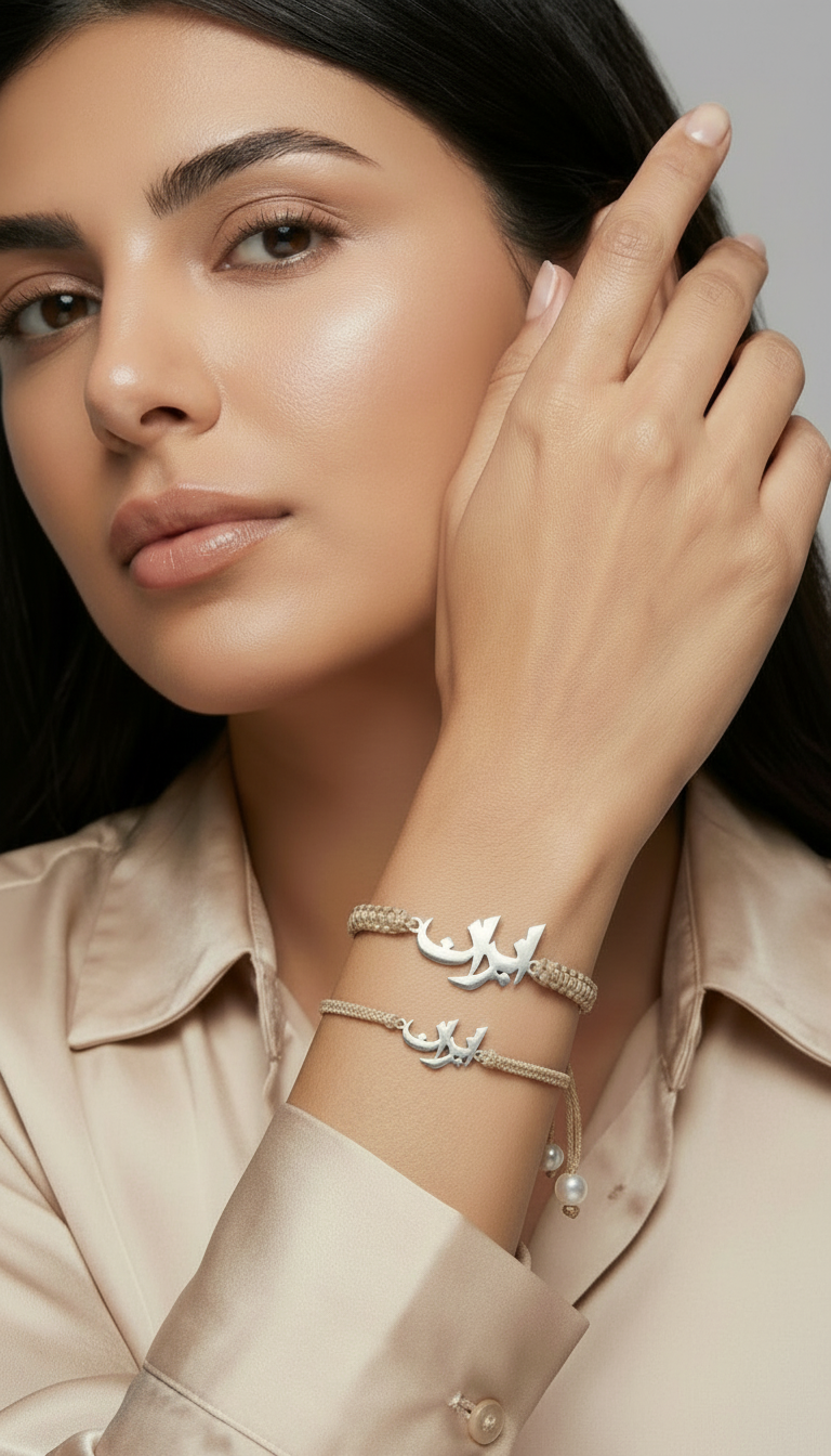 Elegant Arabic name bracelet product photography showcasing craftsmanship and detail. AI-generated for high-impact jewelry marketing and e-commerce.