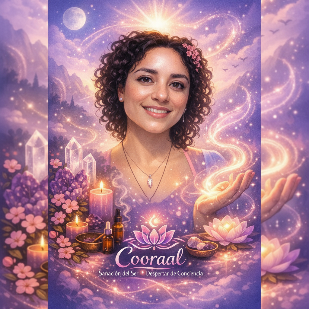 A captivating portrait of a young woman with curly hair, embodying spiritual empowerment and awakening. Features crystals, candles, and ethereal light. AI-gener
