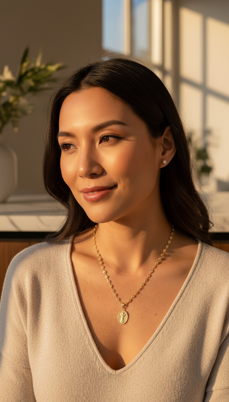 Exquisite 18k gold necklace featuring a unique diamond-cut chain and an intricate oval pendant, perfect for elegant daily wear. AI-generated photography