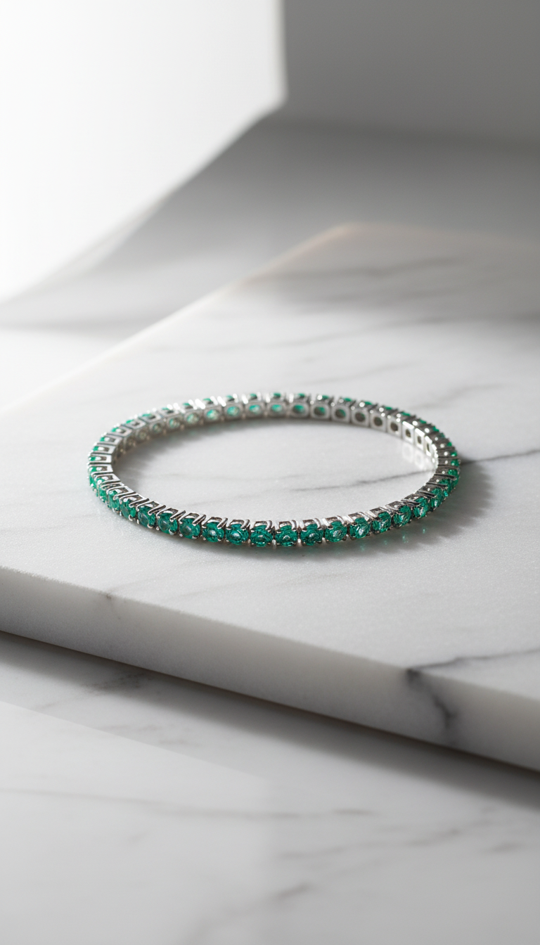 AI-generated jewelry photography showcasing an emerald tennis bracelet. Perfect for e-commerce, catalogs, and marketing. High-quality and ready to impress.