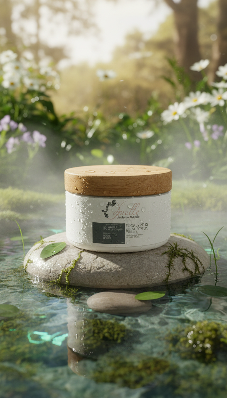 Captivating product photography showcasing eucalyptus body scrub in a natural, serene setting. AI-generated image for beauty and skincare marketing.
