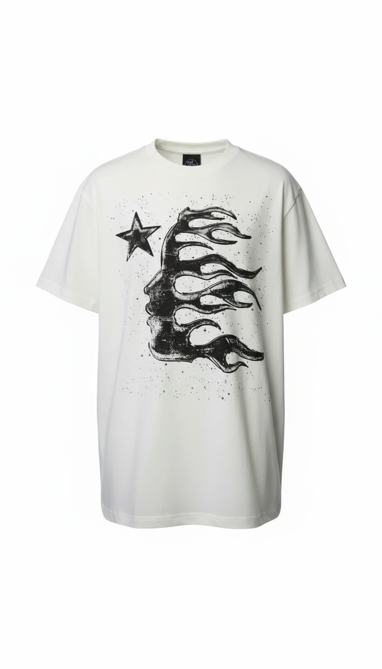 Experience the unique style of this white cotton graphic t-shirt, featuring a striking flame-face design and star motif. Perfect for casual wear. AI-generated p