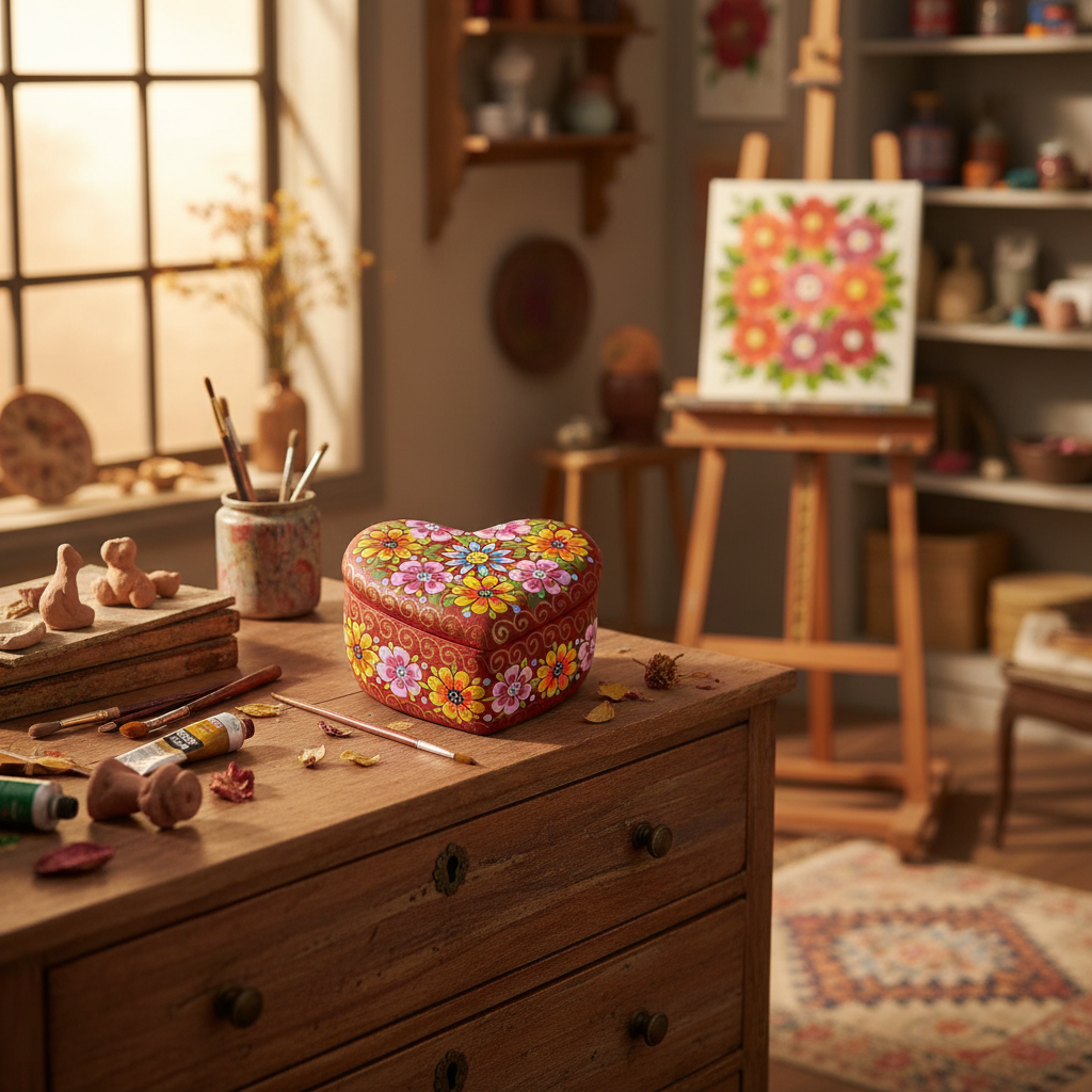 Cozy interior scene featuring a hand-painted floral heart trinket box. AI-generated photography perfect for showcasing artistic crafts and decor.