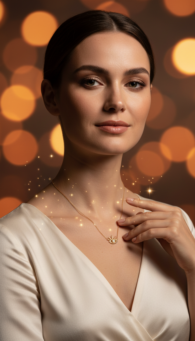 Stunning product photography showcasing a gold eye necklace. AI-generated for high-quality e-commerce and jewelry brand marketing. Order yours today!