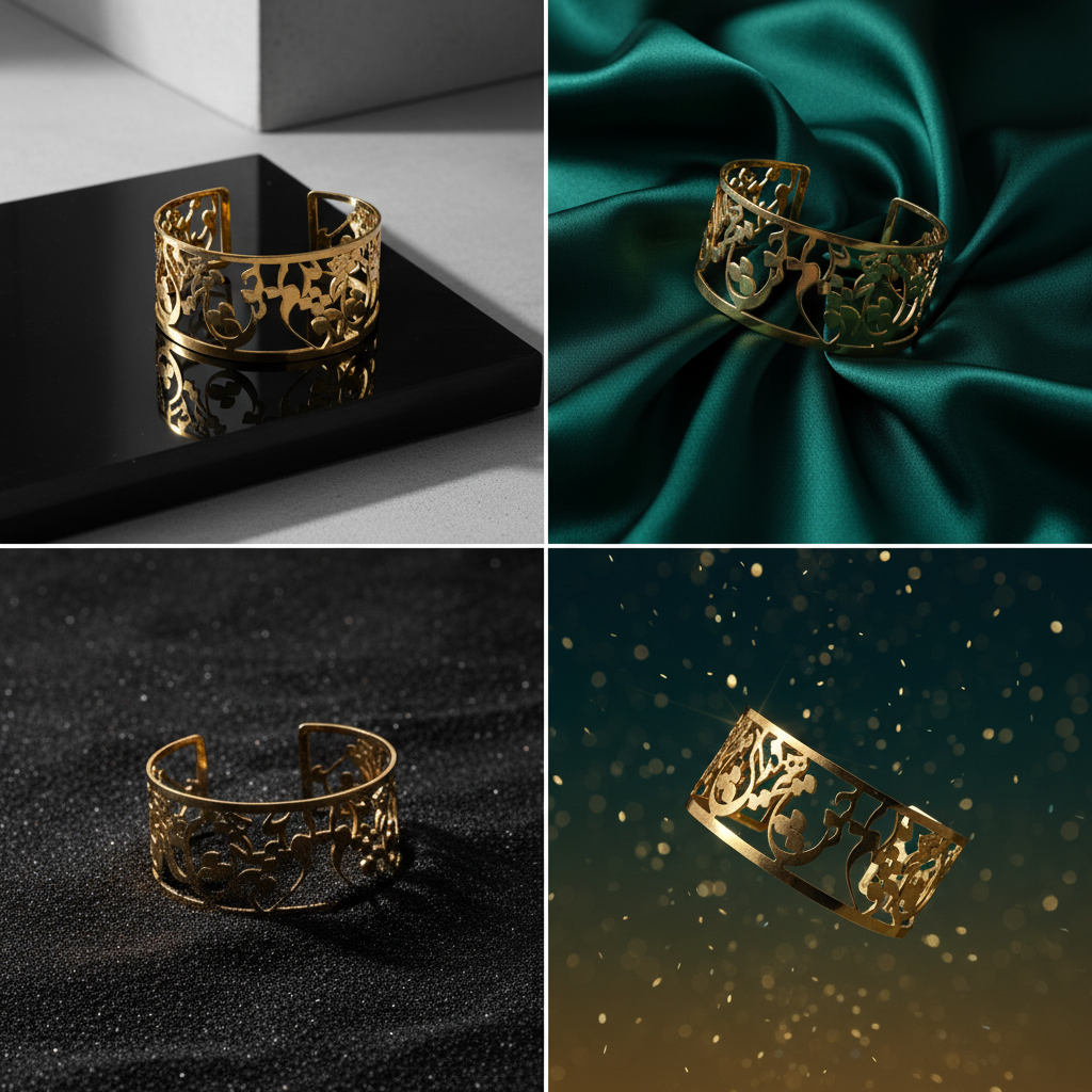 Stunning gold filigree cuff bracelet photography for e-commerce and luxury jewelry marketing. AI-generated product shots that highlight the intricate design.