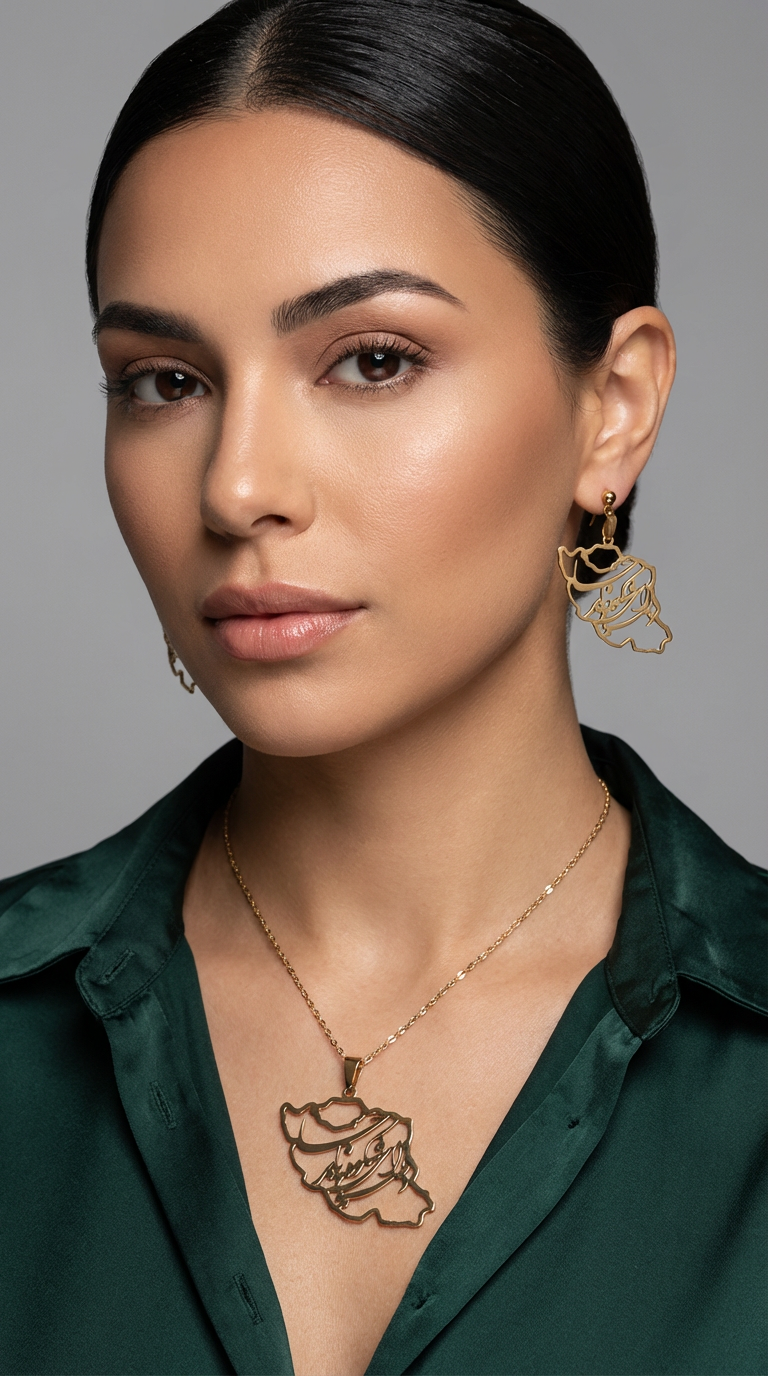 Striking fashion photography featuring gold Iran map earrings and necklace. AI-generated product photo for jewelry e-commerce and marketing.
