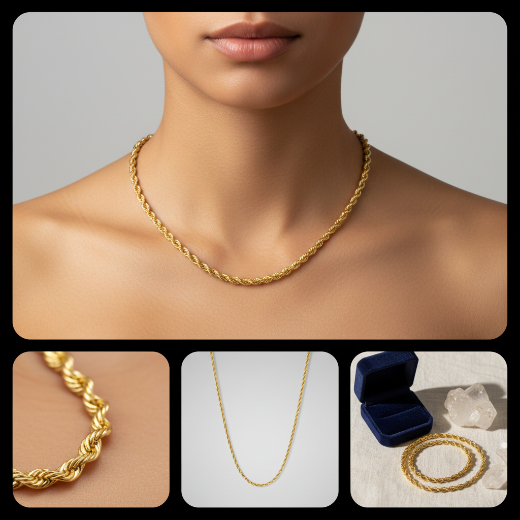 Professional gold rope chain jewelry photography. AI-generated product photo perfect for e-commerce, showcasing detail and elegance. Enhance your brand today!