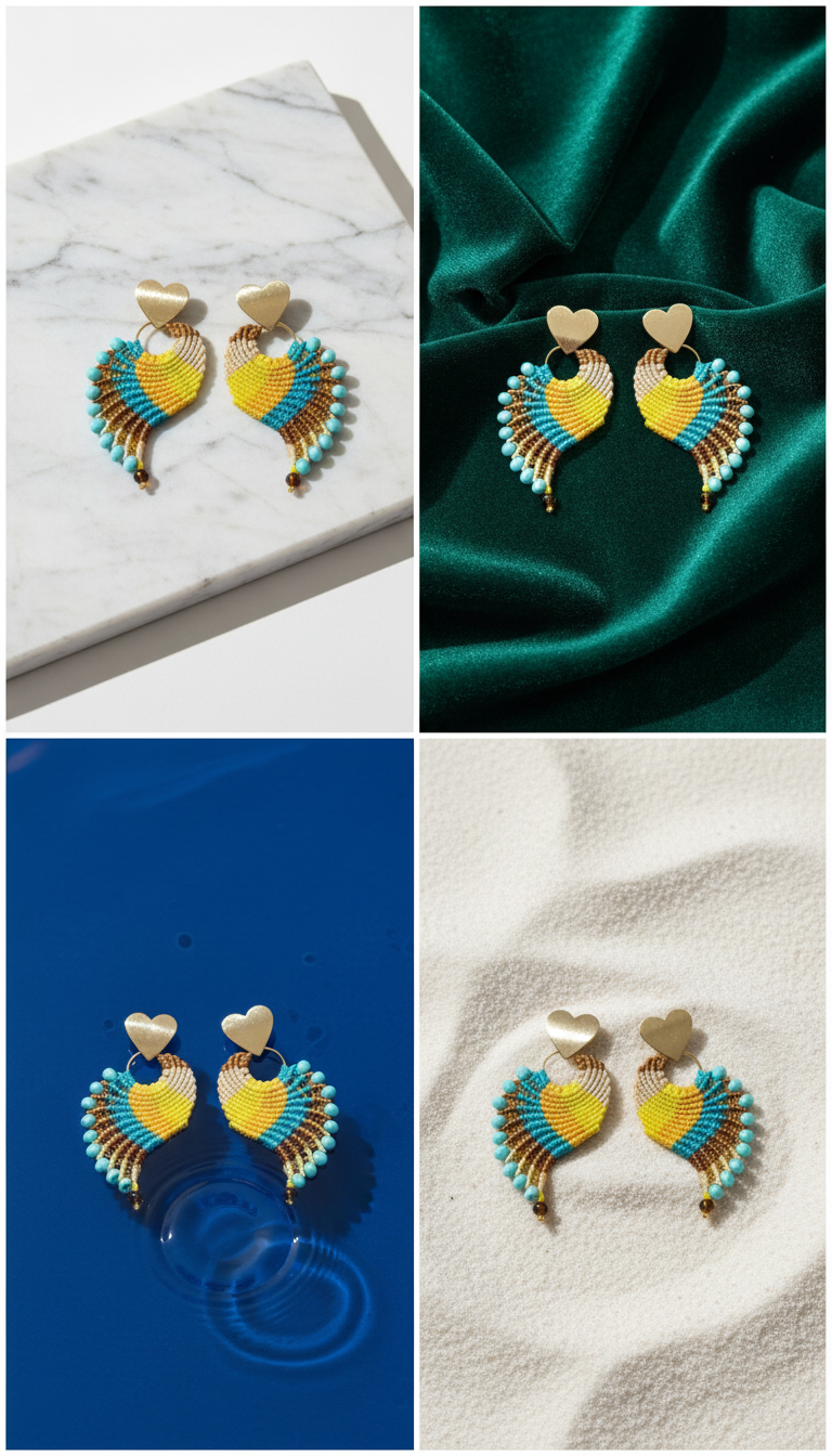 Stunning heart drop earrings photography against vibrant backdrops. AI-generated product shots ideal for jewelry and fashion e-commerce marketing.