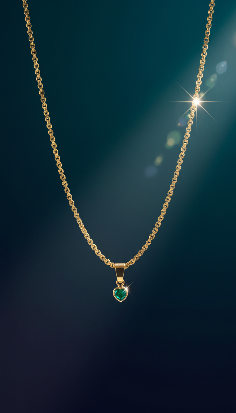 Exquisite 14K gold chain necklace with a vibrant emerald heart pendant. High-polish finish, perfect for elegant wear. AI-generated photography.