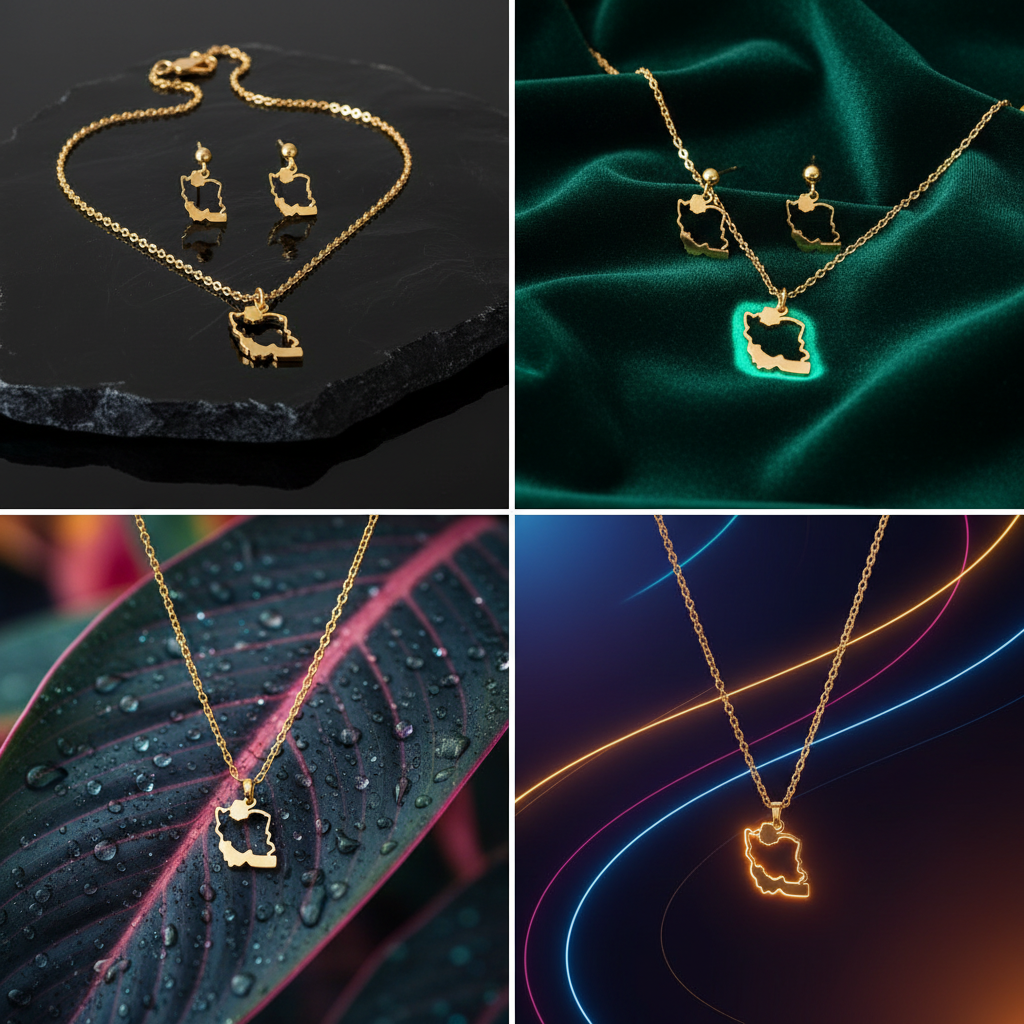 Stunning product photography showcasing Iran map necklace and earrings. AI-generated to highlight design. Perfect for jewelry marketing and e-commerce.