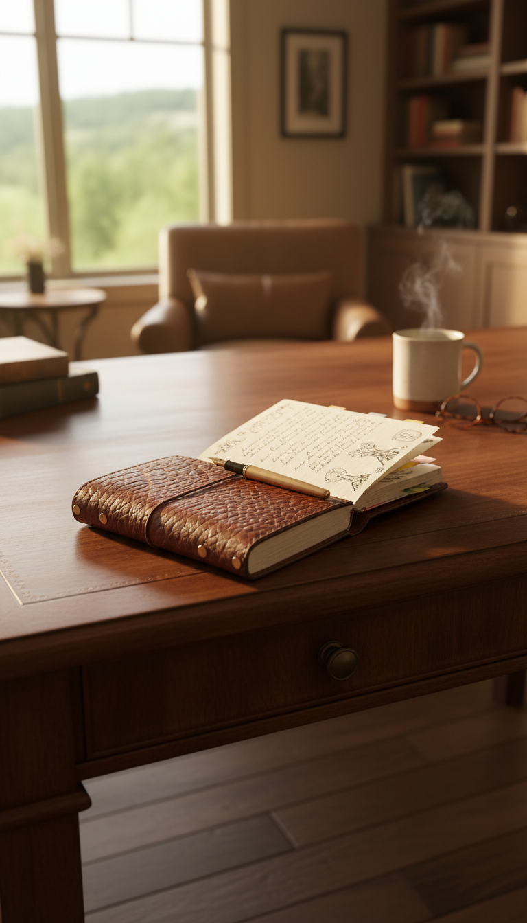 Handcrafted leather journal with a rugged, textured cover, perfect for note-taking and sketching. Features a secure elastic closure. AI-generated photography.