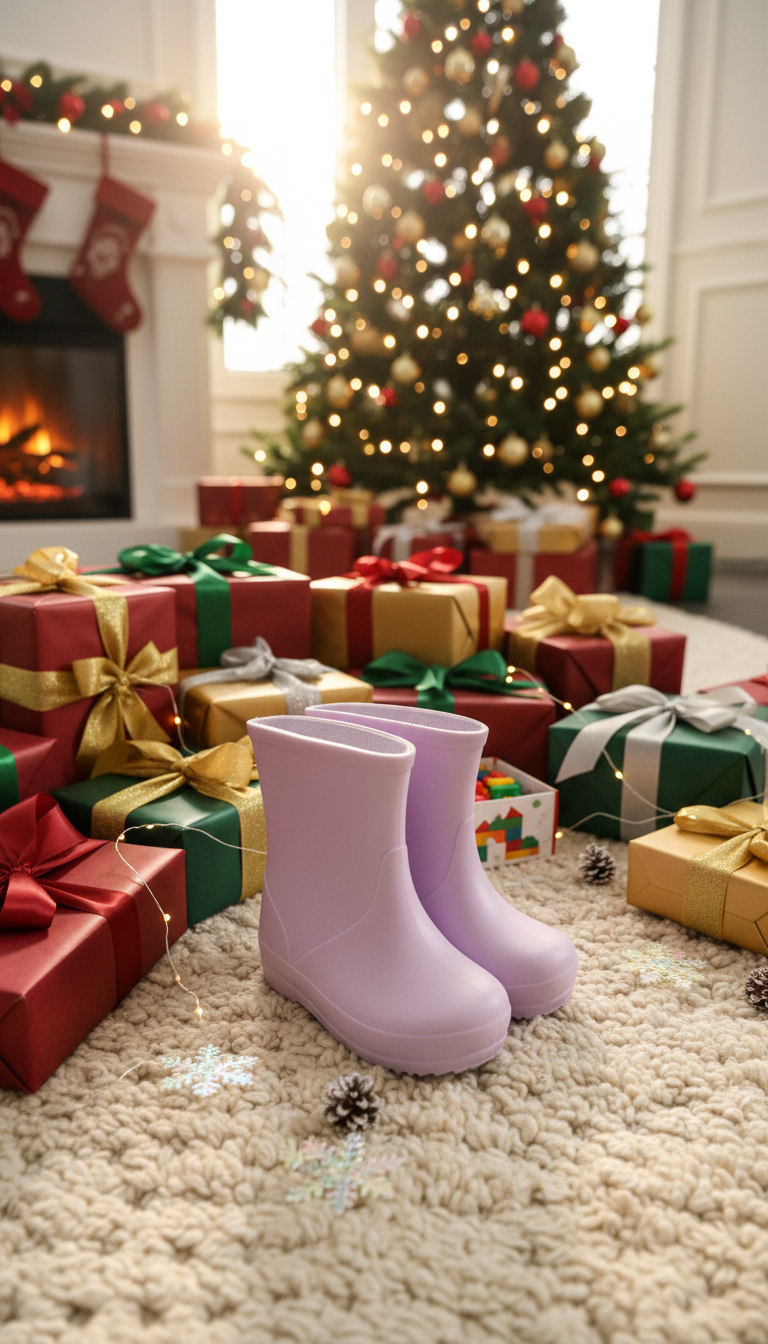 Eye-catching lilac rain boots product photography perfect for the holiday season. AI-generated image to enhance your brand's marketing materials.