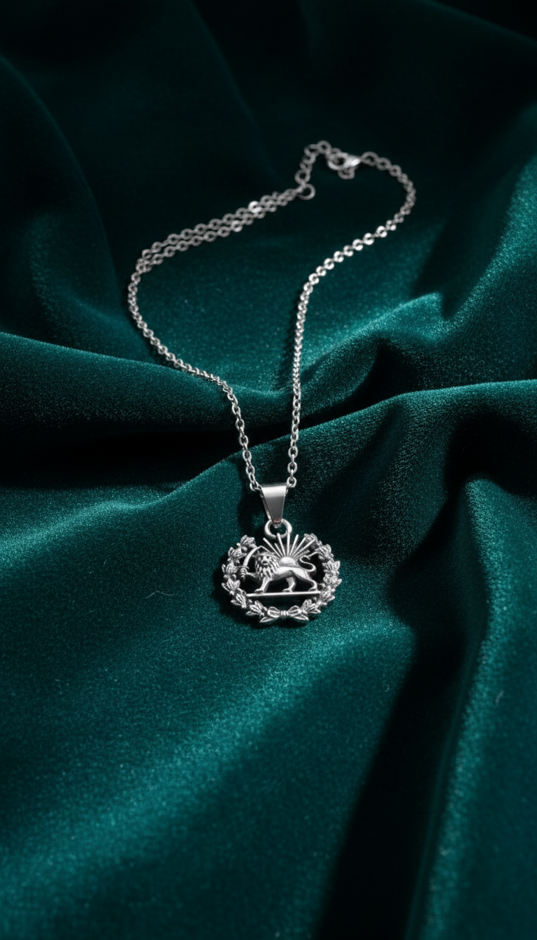 Exquisite silver Lion and Sun pendant necklace, meticulously crafted with intricate detailing. Perfect for cultural expression and elegant wear. AI-generated ph