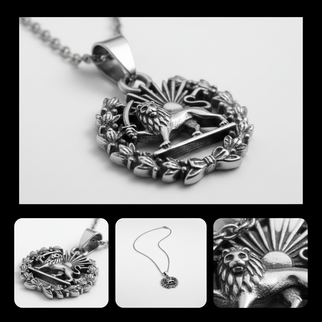 Showcase the intricate details of this silver Lion and Sun pendant necklace through AI-generated photography, highlighting its craftsmanship and design.