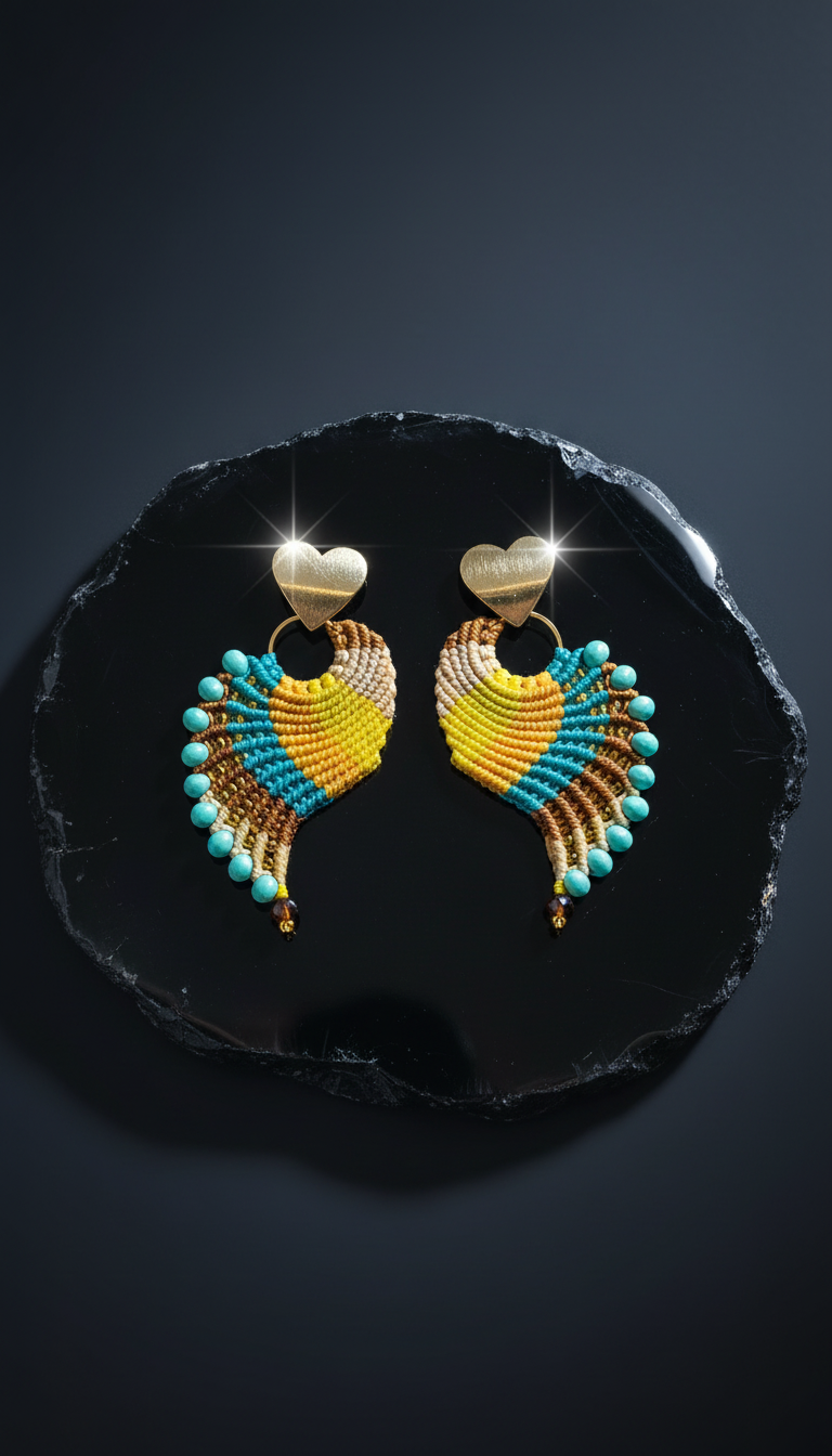 Stunning product photography of colorful macrame earrings. AI-generated image perfect for jewelry e-commerce and online marketing.