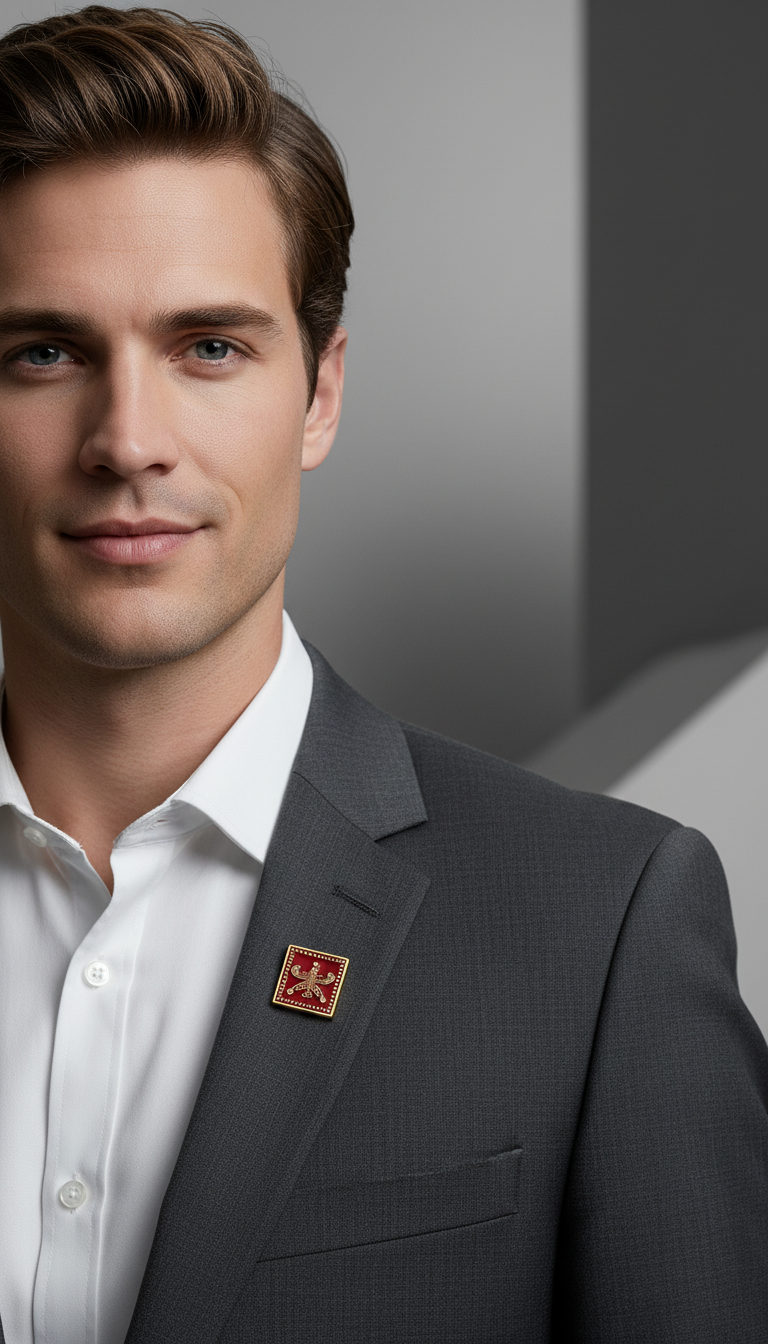 High-quality AI-generated product photography showcasing a man's suit with a unique lapel pin. Ideal for fashion brands and e-commerce marketing.