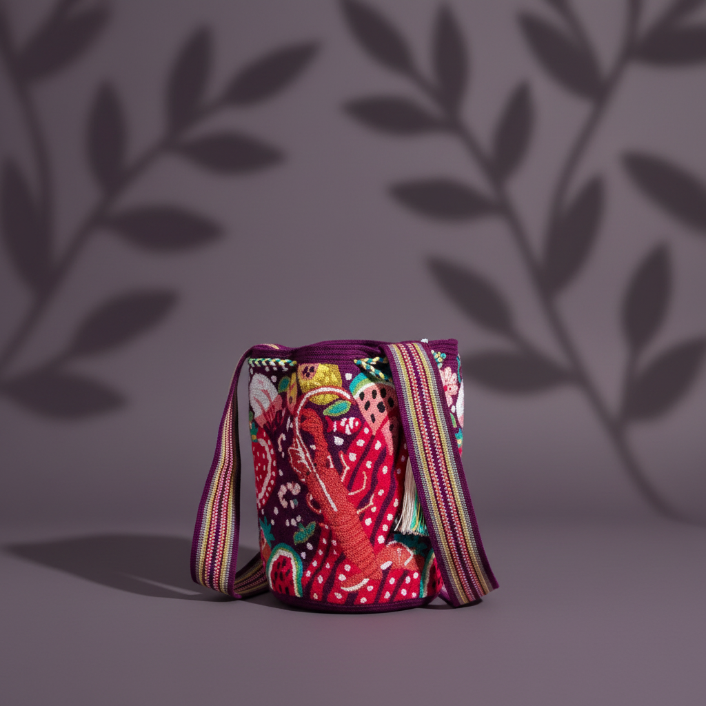 Vibrant mochila bucket bag product photography. Eye-catching, AI-generated fashion image for e-commerce and social media marketing.