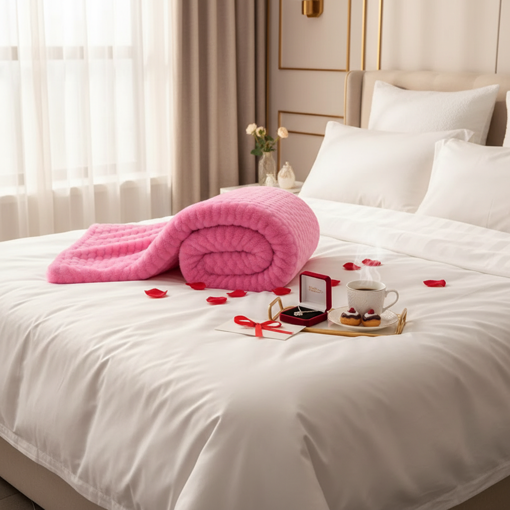 Luxurious pink faux fur throw blanket, soft and plush, perfect for adding warmth and a touch of romance to any setting. AI-generated photography