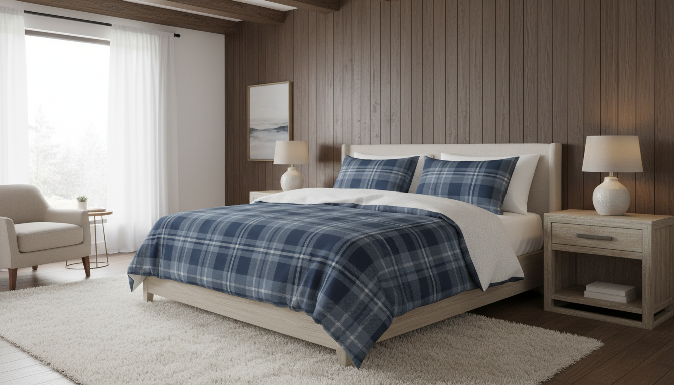 Cozy plaid bedding in a naturally lit bedroom. High-quality AI-generated interior photography for home decor and lifestyle marketing.