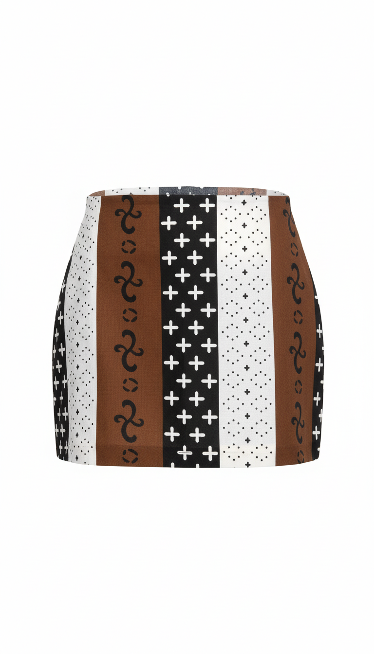 Stylish printed mini skirt featuring unique patterns and a comfortable fit. Perfect for casual or semi-formal wear. AI-generated photography.