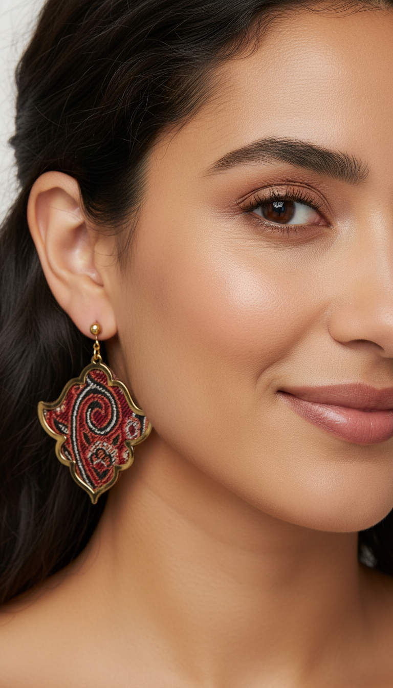 Stunning product shot of statement earrings, highlighting intricate red patterns. AI-generated jewelry photography perfect for e-commerce marketing.