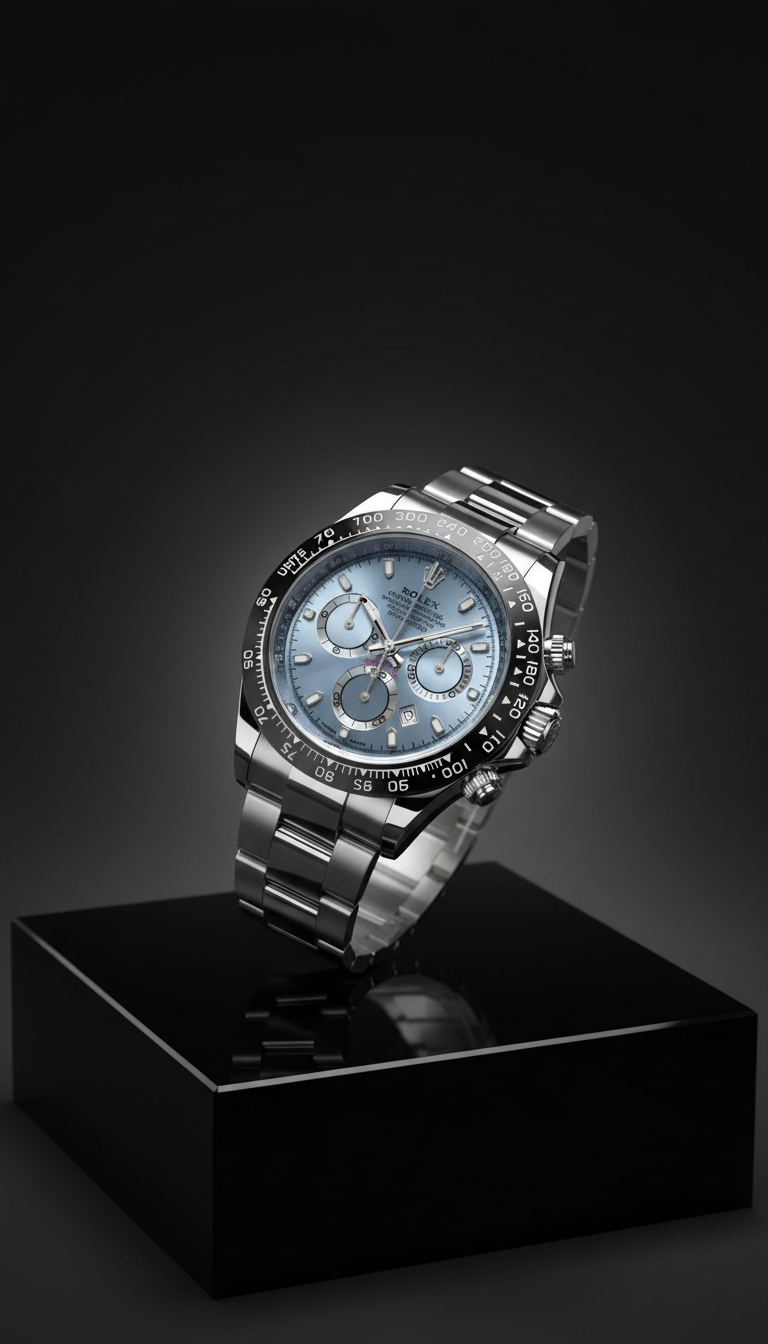 Luxury AI-generated photography of a Rolex Daytona watch featuring a platinum case, ice blue dial, and chronograph functions. AI-generated photography