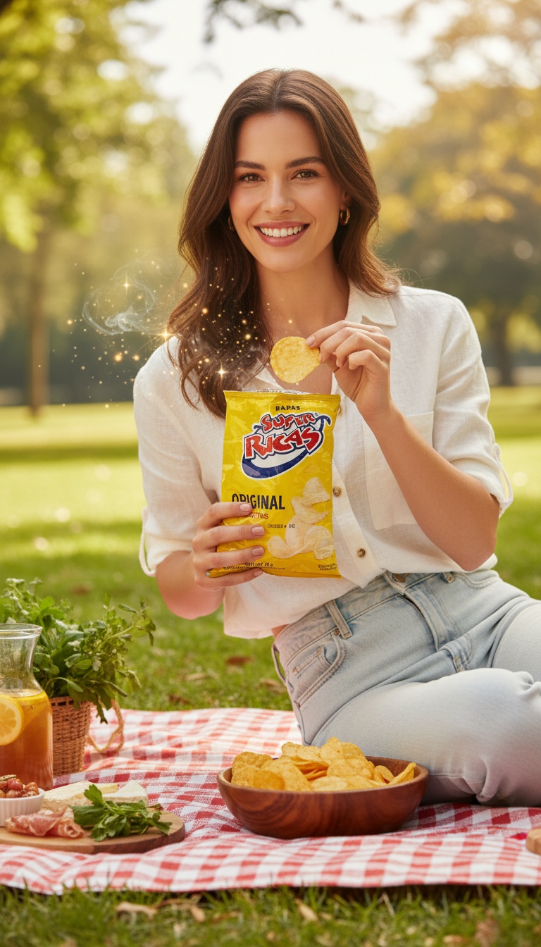 Engaging potato chips lifestyle photography showcasing Super Ricas chips. AI-generated image perfect for food brands and snack advertising.