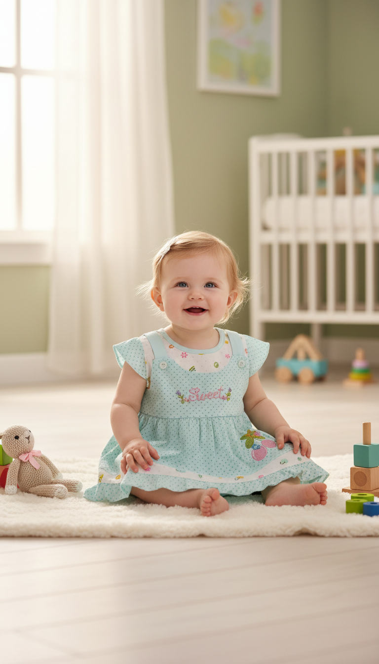 High-quality baby girl dress product photography, showcasing a cute infant in a charming scene. AI-generated for e-commerce & marketing.