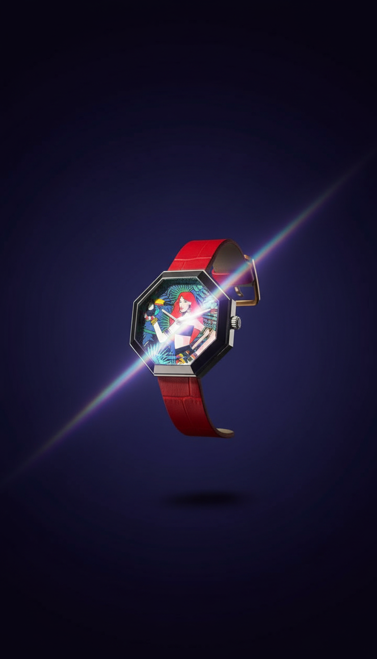 Discover this unique octagonal watch with a vibrant, illustrative dial and bold red strap. A stylish timepiece for any occasion. AI-generated photography