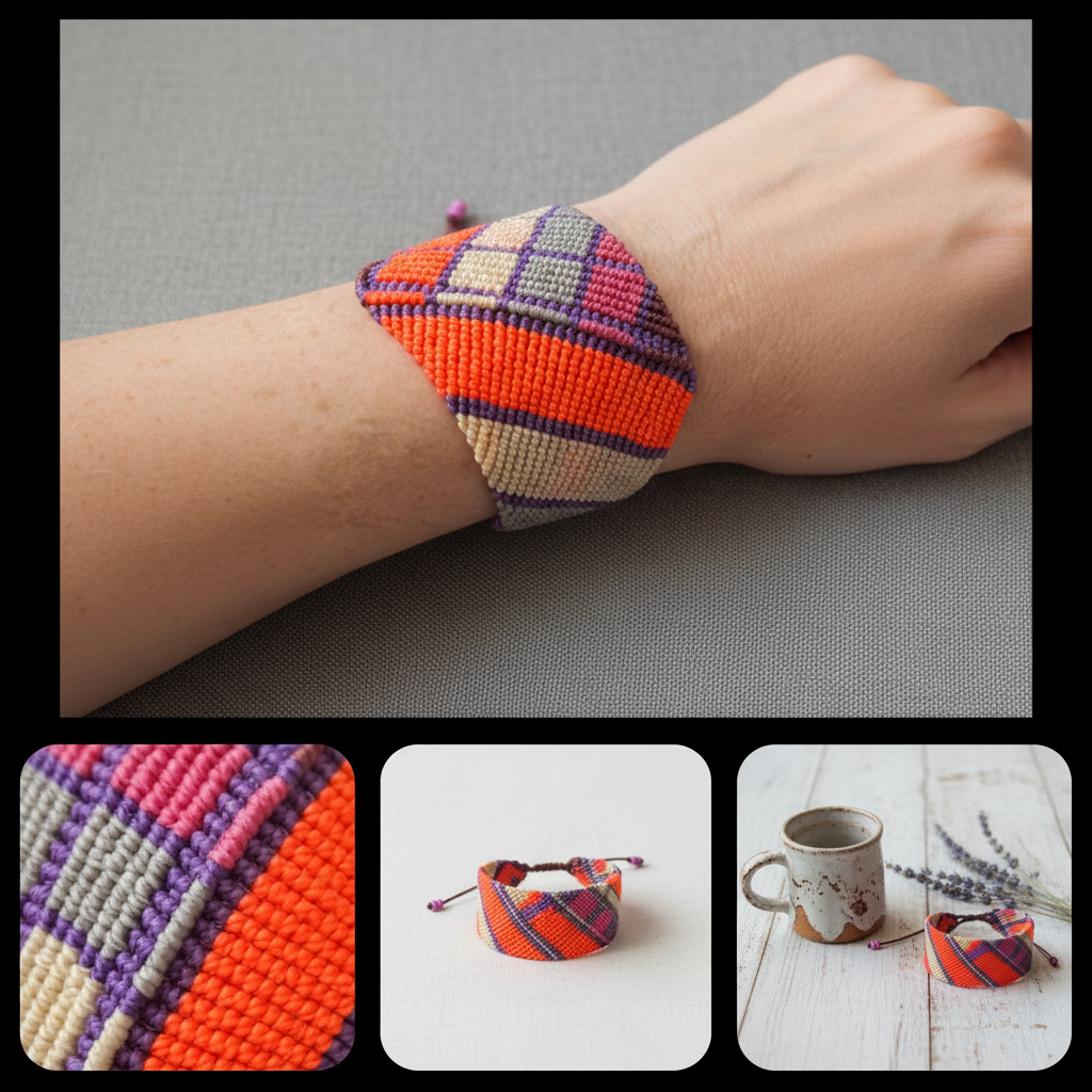 Showcasing a vibrant, handmade macrame bracelet with intricate knotting and a striking color palette. AI-generated photography.
