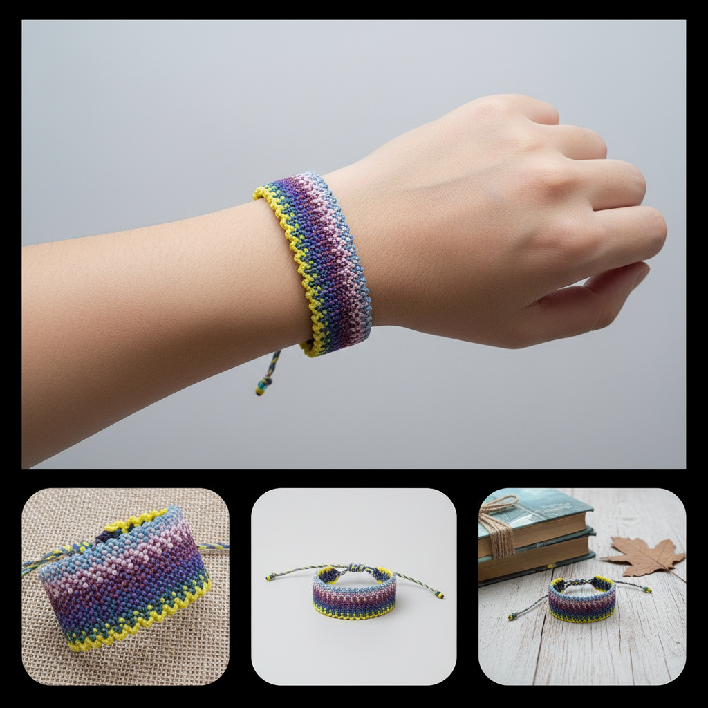 Discover this vibrant, handmade woven friendship bracelet, featuring a colorful zig-zag pattern. Perfect for adding a pop of color to any outfit. AI-generated p